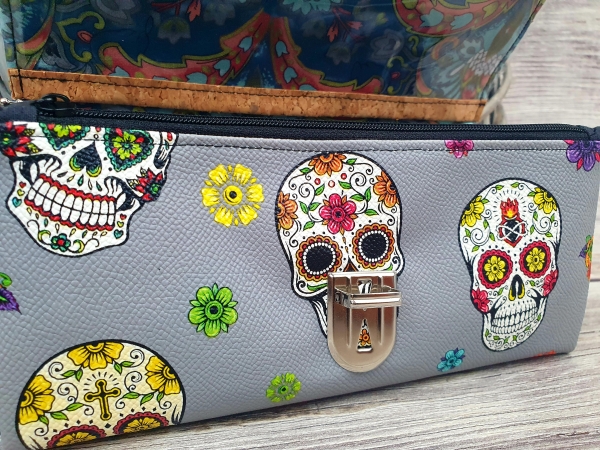 Verarbeitet wurden hier schwarzes Kunstleder mit Struktur, graues Kunstleder bedruckt mit farbigen Totenköpfen und Baumwolle - die so gut verstärkt sind, dass die Geldbörse wunderbar stabil ist.